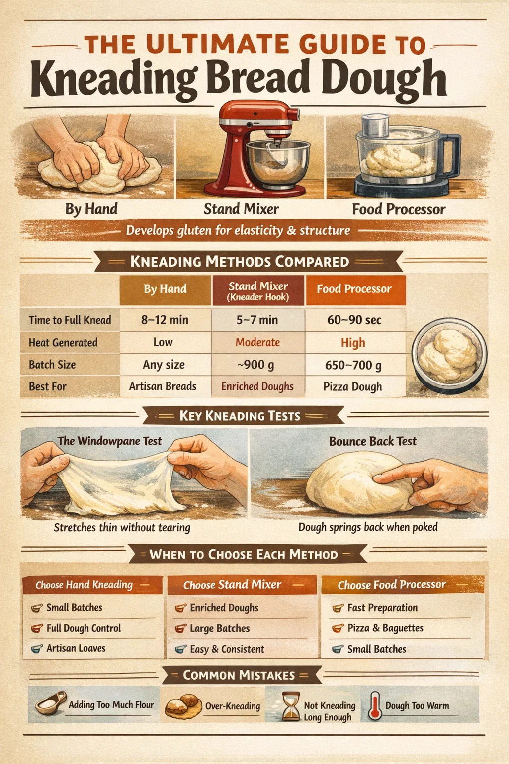 Valmistelet sitten voileipäleipää, pizzataikinaa tai pehmeitä päivällissämpylöitä, vaivaaminen on vaihe, joka määrittää kaiken. Voit vaivata taikinan tehokkaasti käsin 8-10 minuutissa, seisomavatkaimella 5-7 minuutissa tai monitoimikoneella vain 60–90 sekunnissa. Jokainen menetelmä aktivoi gluteenia eri tavalla ja sopii eri leipureille riippuen heidän työkaluistaan, erän koosta ja kuinka paljon he haluavat osallistua prosessiin. Tämä opas kattaa kaikki kolme menetelmää yksityiskohtaisesti - mukaan lukien tekniikka, ajoitus, yleiset virheet ja tarkalleen milloin käyttää a vaivaaja kiinnitys verrattuna käsin tekemiseen.