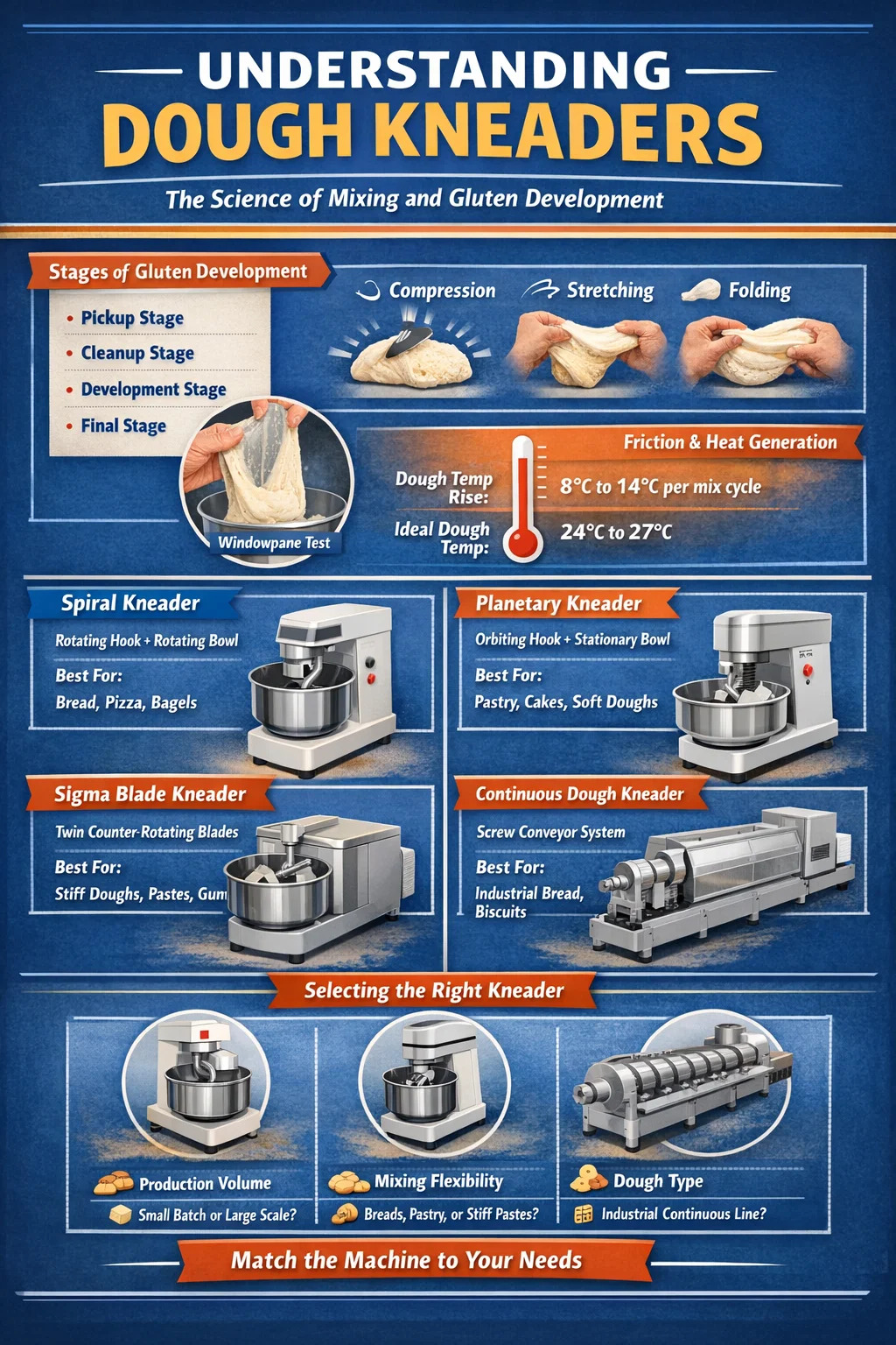 Käytätpä pientä spiraalivaivauskonetta naapuruston leipomossa tai jatkuvatoimista teollista taikinavaivauskonetta, joka prosessoi useita tonneja tunnissa, taustalla oleva fysiikka ja kemia pysyvät yhtenäisinä. Muutoksia on mittakaava, sekoittimen geometria ja käyttäjän käytettävissä oleva prosessin ohjauksen taso.