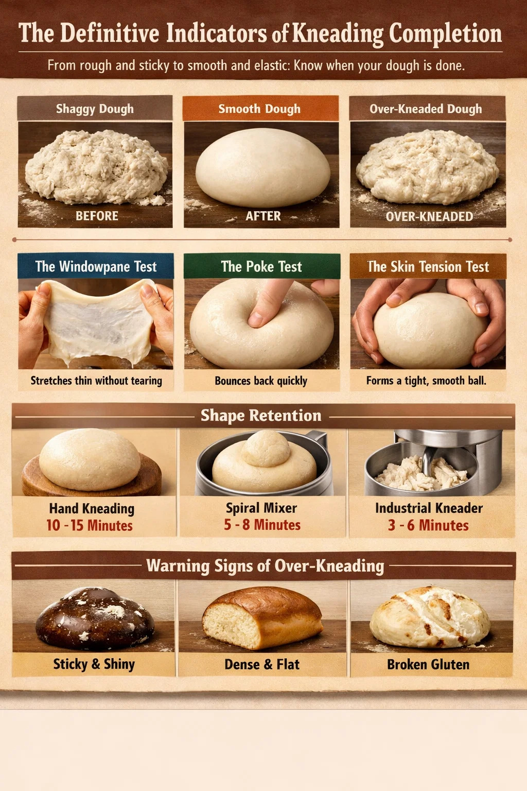 Sen sijaan, että luottaisit pelkästään ajastimeen, joka voi olla epätarkka kosteuden tai jauhojen proteiinipitoisuuden vuoksi, käytä näitä fyysisiä vertailuarvoja tarkistaaksesi laitteen tilan. vaivataan materiaalia.