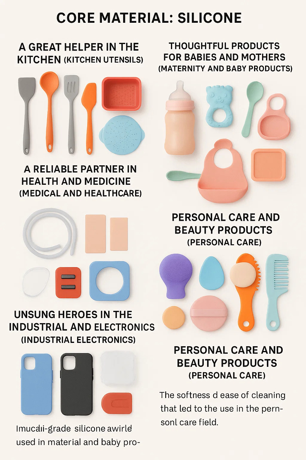 Silikoni tuotteet ovat erilaisia esineitä, jotka on valmistettu erityisestä silikonista. Se ei ole sama kuin elektroniikkatuotteissa oleva "pii". Tässä on erittely silikonituotteista: