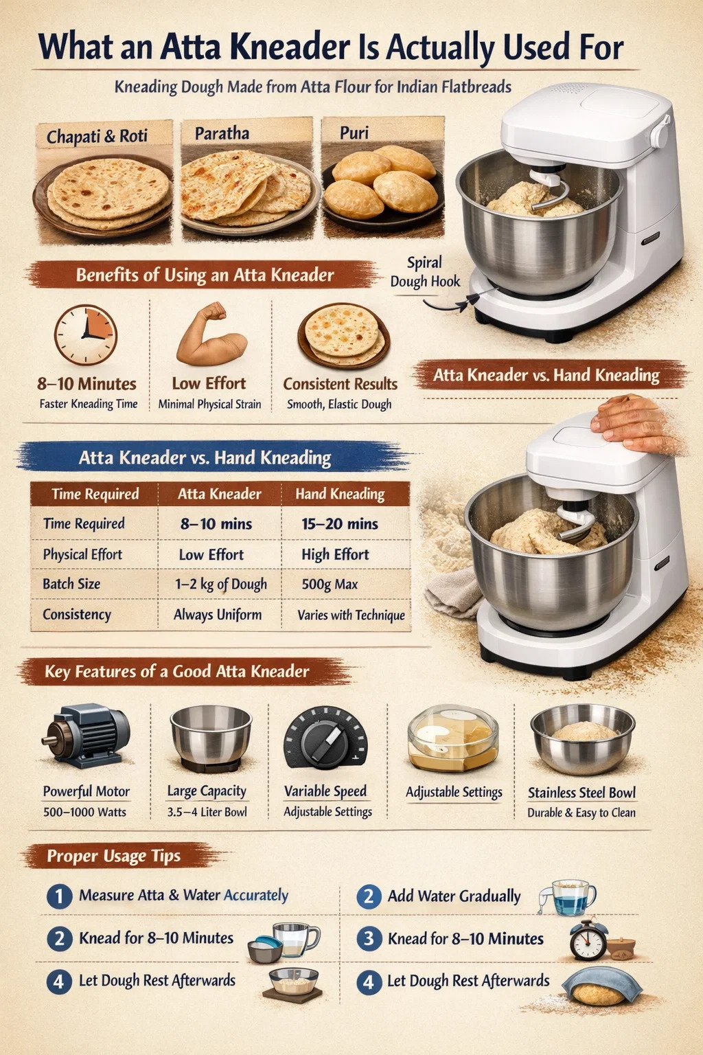 Kriittinen kohta on, että atta – täysjyvävehnäjauho, jossa on korkeampi kuitupitoisuus kuin puhdistettu jauho – on tiheämpää ja kestää paremmin kosteutta. Attalle rakennettu vaivauskone on kalibroitu käsittelemään tätä tiheyttä ylikuumenematta moottoria tai rasittamatta mekanismia.